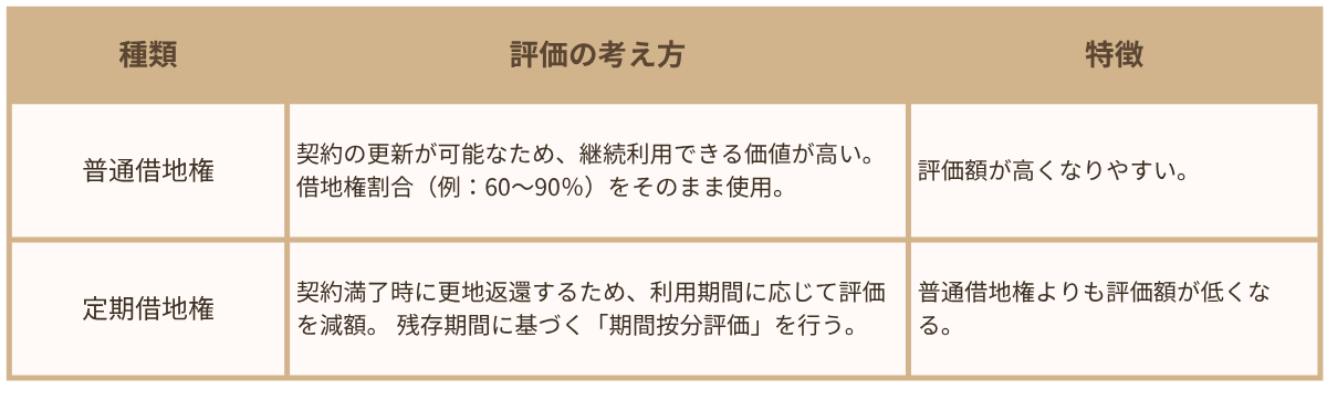 旧法借地権ではいつ土地を返してもらえるか分からない、という地主さんの不安が解消されるというメリットと共に、更新はないという特性から、相続税評価額も普通借地権より低くなる傾向があります。
