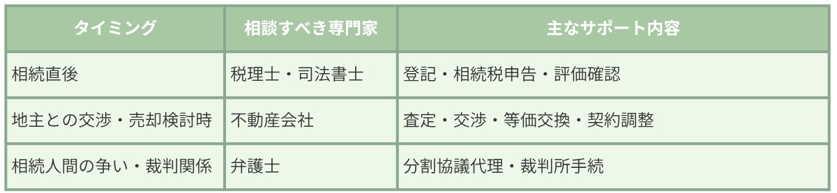 名義変更・地代の支払いなど、誰が対応するか曖昧だと問題が起きやすい部分です。 - 専門家の相談先(税理士・司法書士・不動産会社)を決めておく