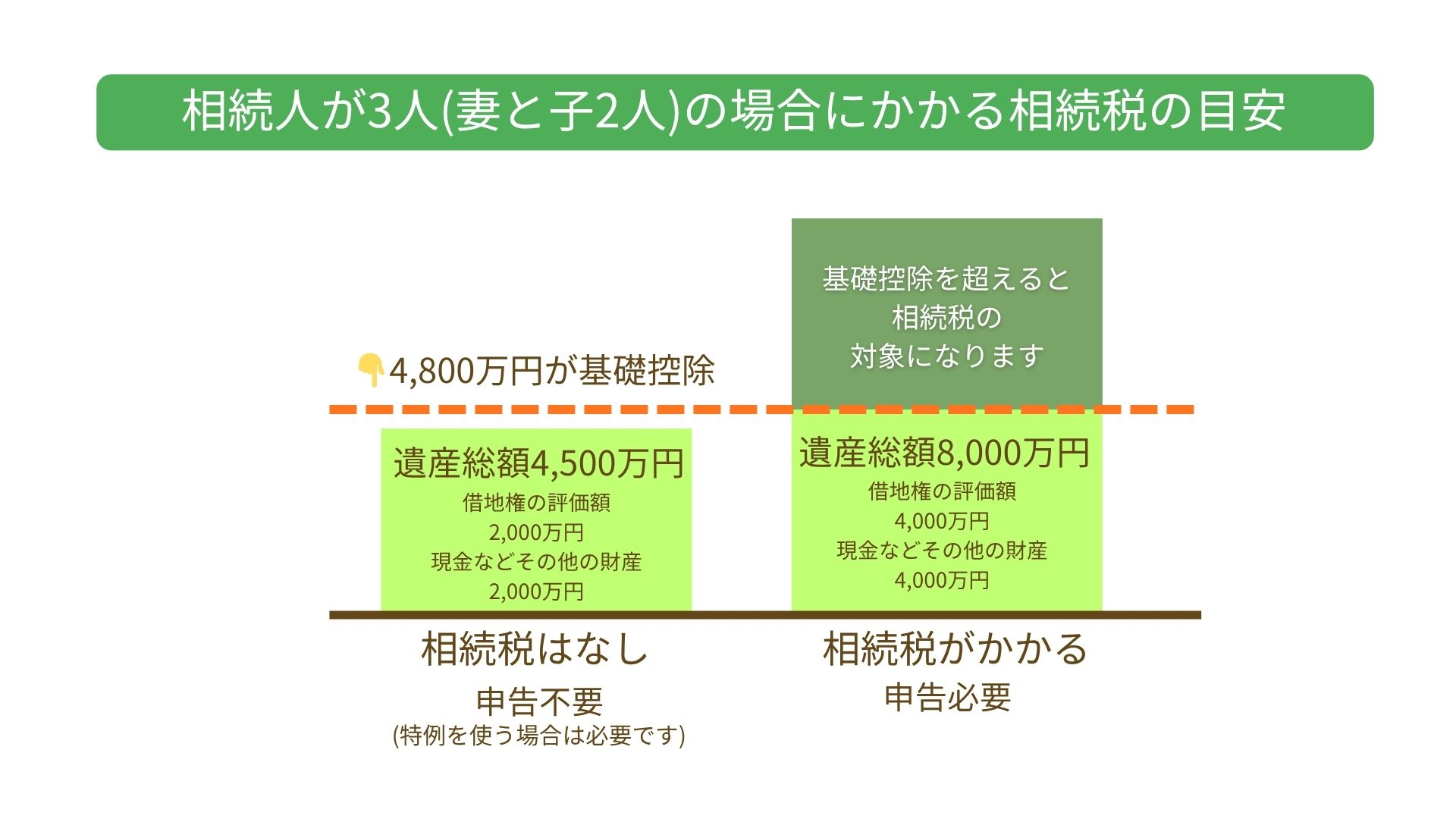 税金には「基礎控除(きそこうじょ)」といって、 一定の金額までは相続税がかからない仕組みがあります。