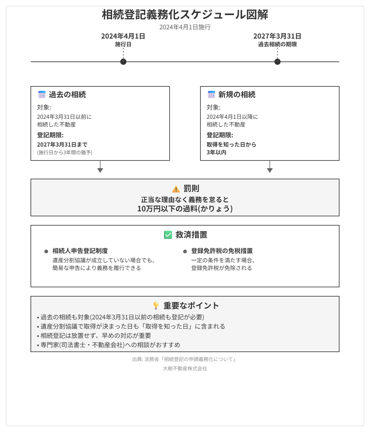 つまり、「昔の相続だから大丈夫」ということはないんですね。施行日である2024年4月1日から3年以内の経過措置期間が設定されているため、古い相続であっても対応が必要になります。