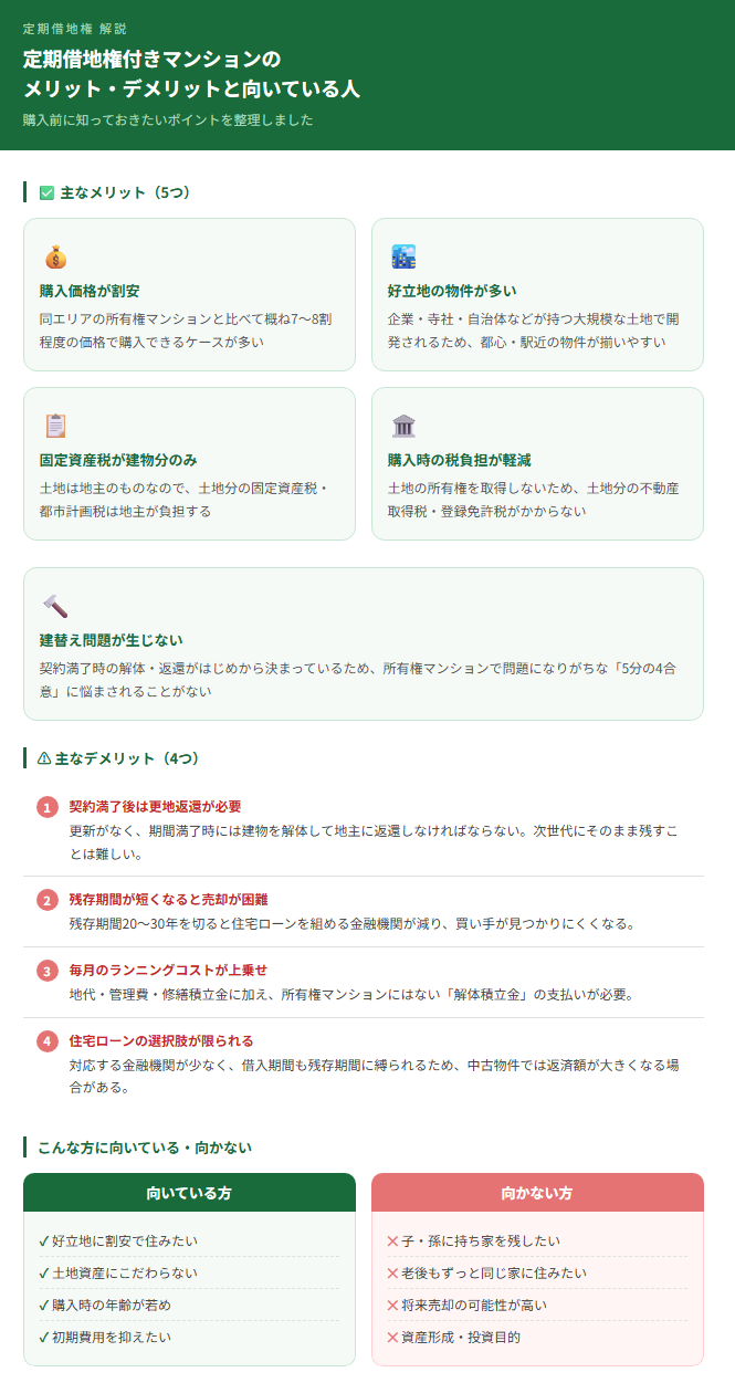 • 同エリアの所有権マンションより購入価格を抑えられる・好立地が多い・固定資産税が建物分のみ、といったメリットがある